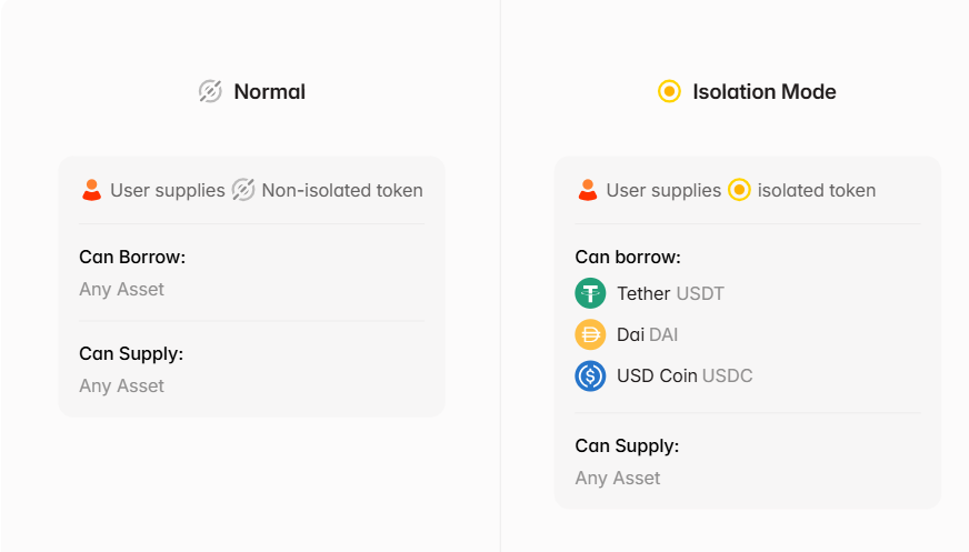 Le mode d’isolement permet de lister des actifs nouveaux ou plus volatils sans introduire de risque systémique dans l’ensemble du protocole. Lorsqu’un actif est répertorié en mode isolement, il peut être utilisé comme garantie pour emprunter. Mais seulement un panier spécifique d’actifs (généralement des pièces stables), et jusqu’à un plafond de dette désigné. Cela contient les risques tout en augmentant le nombre d’actifs pris en charge.